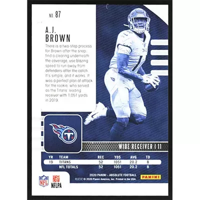 This is a 2020 Absolute Orange Mosaic A.J. Brown football card. The card is #87 and pictures show condition. This card is limited; #'d 008/149. Team(s): Tennessee Titans