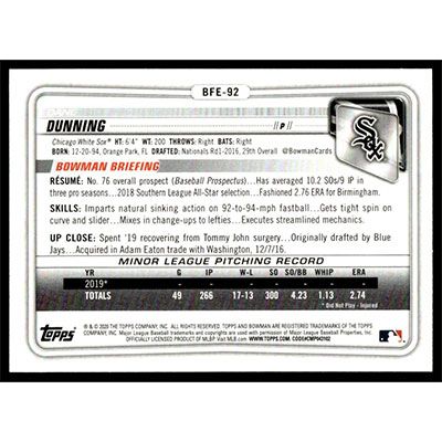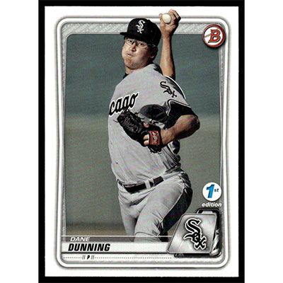 This is a 2020 Bowman 1st Edition Dane Dunning baseball card. The card is #BFE-92 and pictures show condition.