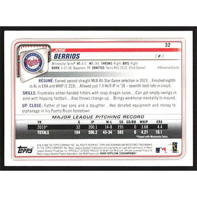 This is a 2020 Bowman Jose Berrios baseball card. The card is #32 and pictures show condition.