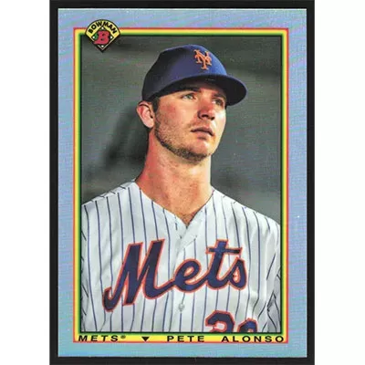 This is a 2020 Bowman '90 Pete Alonso baseball card. The card is #90B-PA and pictures show condition.