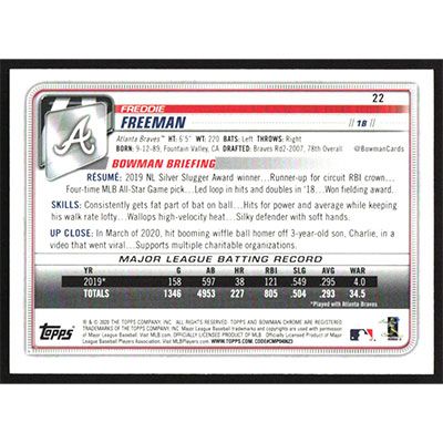 This is a 2020 Bowman Chrome Freddie Freeman baseball card. The card is #22 and pictures show condition.