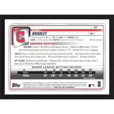 This is a 2020 Bowman Chrome Bobby Bradley baseball card. The card is #47 and pictures show condition.