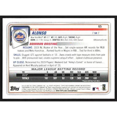 This is a 2020 Bowman Chrome Pete Alonso baseball card. The card is #65 and pictures show condition.