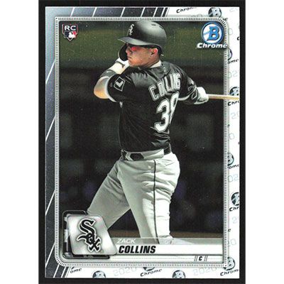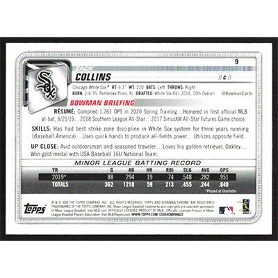 This is a 2020 Bowman Chrome Zack Collins baseball card. The card is #9 and pictures show condition.