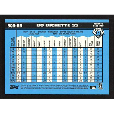 This is a 2020 Bowman Chrome '90 Bo Bichette baseball card. The card is #90B-BB and pictures show condition. Team(s): Toronto Blue Jays Rookie Card (RC)