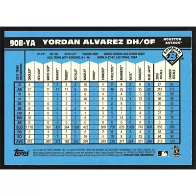 This is a 2020 Bowman Chrome '90 Yordan Alvarez baseball card. The card is #90B-YA and pictures show condition. Team(s): Houston Astros Rookie Card (RC)