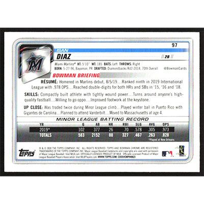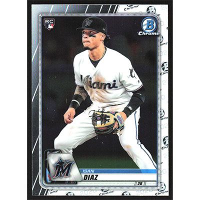 This is a 2020 Bowman Chrome Isan Diaz baseball card. The card is #97 and pictures show condition.