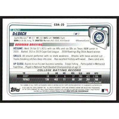 This is a 2020 Bowman Chrome Draft Autographs Zach DeLoach autographed baseball card. This card has been signed, in blue, by Zach DeLoach, and is certified authentic by Topps. The card is #CDA-ZD and pictures show condition.