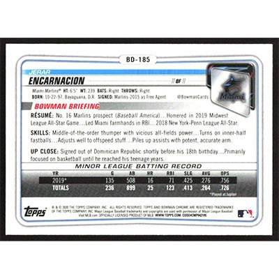 This is a 2020 Bowman Chrome Draft Jerar Encarnacion baseball card. The card is #BD-185 and pictures show condition.