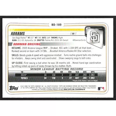 This is a 2020 Bowman Chrome Draft CJ Abrams baseball card. The card is #BD-189 and pictures show condition.
