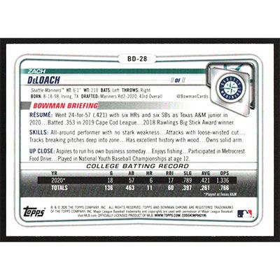 This is a 2020 Bowman Chrome Draft Zach DeLoach baseball card. The card is #BD-28 and pictures show condition.