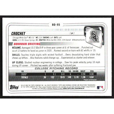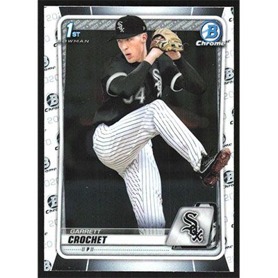 This is a 2020 Bowman Chrome Draft Garrett Crochet baseball card. The card is #BD-95 and pictures show condition.