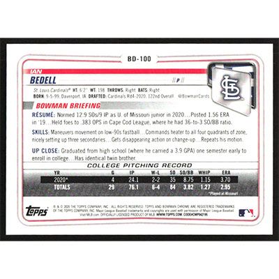 This is a 2020 Bowman Chrome Draft Purple Refractors Ian Bedell baseball card. The card is #BD-100 and pictures show condition. This card is limited; #'d 016/250.