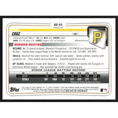This is a 2020 Bowman Chrome Draft Refractors Oneil Cruz baseball card. The card is #BD-65 and pictures show condition.