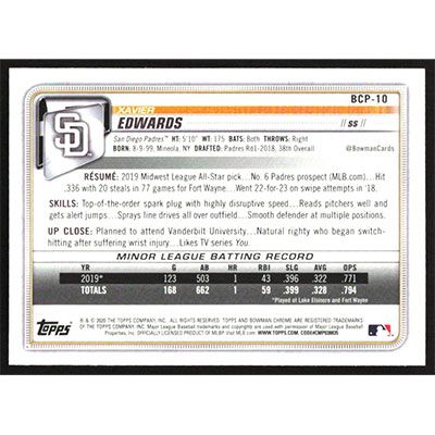 This is a 2020 Bowman Chrome Mega Box Prospects Refractors Xavier Edwards baseball card. The card is #BCP-10 and pictures show condition. Team(s): San Diego Padres