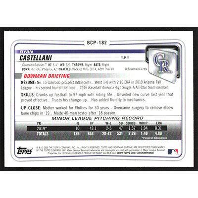 This is a 2020 Bowman Chrome Mega Box Prospects Refractors Ryan Castellani baseball card. The card is #BCP-182 and pictures show condition. Team(s): Colorado Rockies