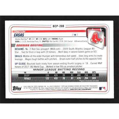 This is a 2020 Bowman Chrome Mega Box Prospects Refractors Triston Casas baseball card. The card is #BCP-208 and pictures show condition. Team(s): Boston Red Sox
