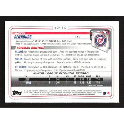 This is a 2020 Bowman Chrome Mega Box Prospects Refractors Mason Denaburg baseball card. The card is #BCP-217 and pictures show condition. Team(s): Washington Nationals