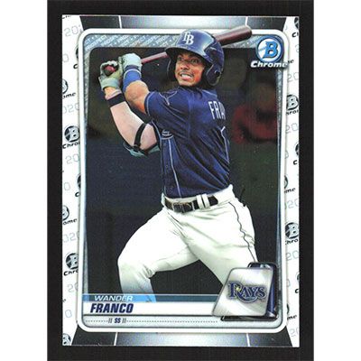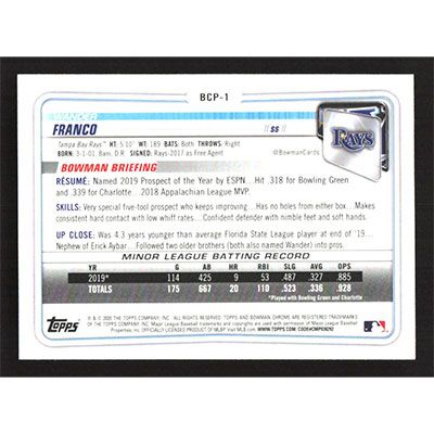 This is a 2020 Bowman Chrome Prospects Wander Franco baseball card. The card is #BCP-1 and pictures show condition.