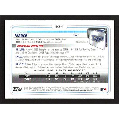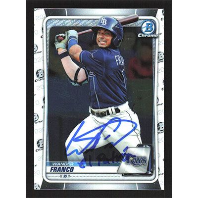 This is a 2020 Bowman Chrome Prospects Wander Franco El Patron Inscription autographed baseball card. This card has been signed, in blue, by Wander Franco, and is guaranteed authentic by Ballcardz.com. The card is #BCP-1 and pictures show condition.