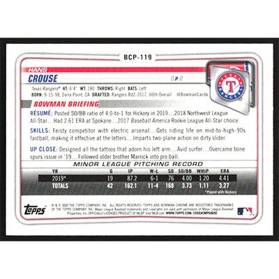 This is a 2020 Bowman Chrome Prospects Hans Crouse baseball card. The card is #BCP-119 and pictures show condition.