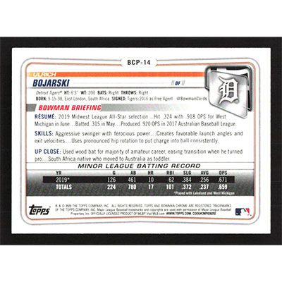 This is a 2020 Bowman Chrome Prospects Ulrich Bojarski baseball card. The card is #BCP-14 and pictures show condition.