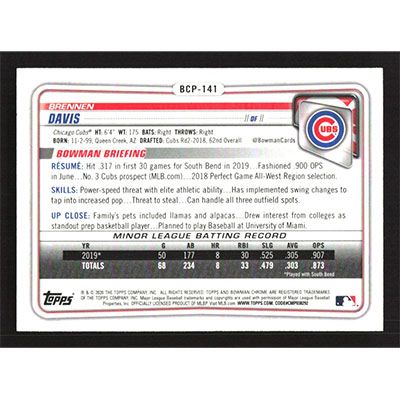 This is a 2020 Bowman Chrome Prospects Brennen Davis baseball card. The card is #BCP-141 and pictures show condition.