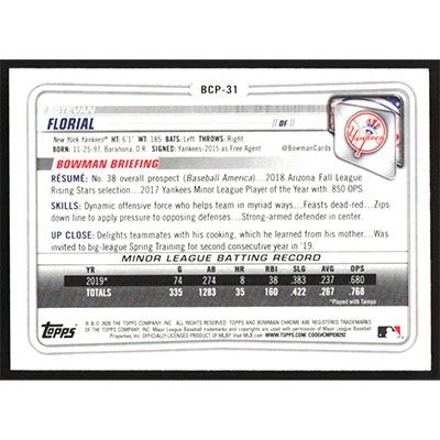 This is a 2020 Bowman Chrome Prospects Estevan Florial baseball card. The card is #BCP-31 and pictures show condition.