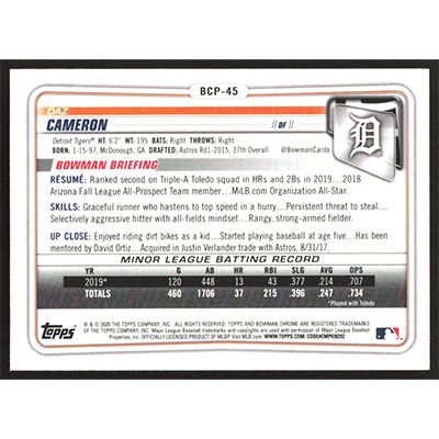 This is a 2020 Bowman Chrome Prospects Daz Cameron baseball card. The card is #BCP-45 and pictures show condition.