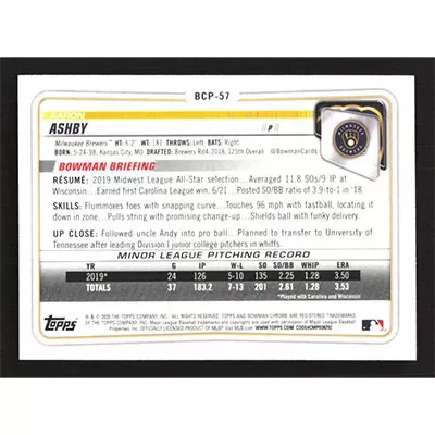 This is a 2020 Bowman Chrome Prospects Aaron Ashby baseball card. The card is #BCP-57 and pictures show condition.