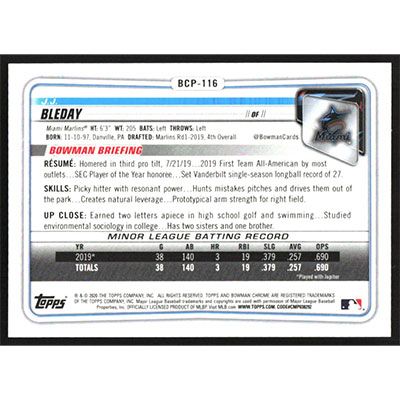 This is a 2020 Bowman Chrome Prospects Green Refractors J.J. Bleday baseball card. The card is #BCP-116 and pictures show condition. This card is limited; #'d 64/99.