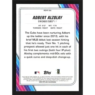 This is a 2020 Bowman Chrome Rookie of the Year Favorites Adbert Alzolay baseball card. The card is #ROYF-AA and pictures show condition. Team(s): Chicago Cubs Rookie Card (RC)