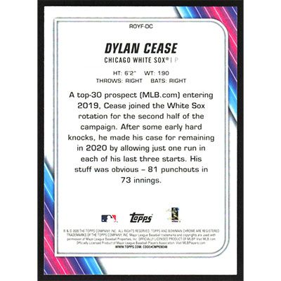 This is a 2020 Bowman Chrome Rookie of the Year Favorites Dylan Cease baseball card. The card is #ROYF-DC and pictures show condition. Team(s): Chicago White Sox Rookie Card (RC)