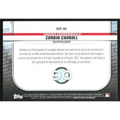 This is a 2020 Bowman Chrome Scouts Top 100 Corbin Carroll baseball card. The card is #BTP-90 and pictures show condition.