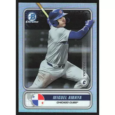 This is a 2020 Bowman Chrome Spanning the Globe Miguel Amaya baseball card. The card is #STG-MA and pictures show condition.