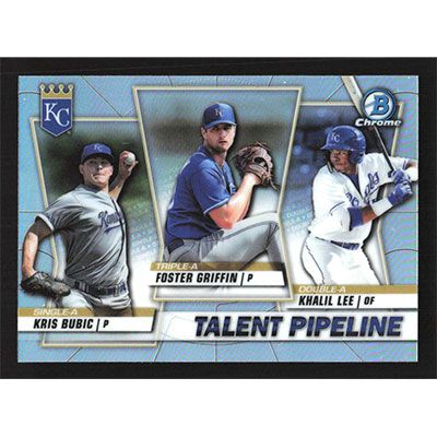 This is a 2020 Bowman Chrome Talent Pipeline Kris Bubic, Foster Griffin and Khalil Lee baseball card. The card is #TP-KCR and pictures show condition. Team(s): Kansas City Royals