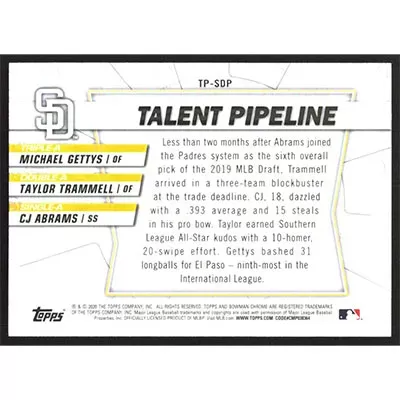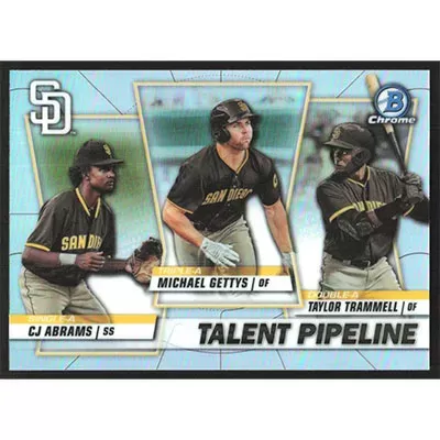 This is a 2020 Bowman Chrome Talent Pipeline CJ Abrams, Michael Gettys and Taylor Trammell baseball card. The card is #TP-SDP and pictures show condition.