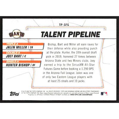 This is a 2020 Bowman Chrome Talent Pipeline Hunter Bishop, Joey Bart and Jalen Miller baseball card. The card is #TP-SFG and pictures show condition. Team(s): San Francisco Giants