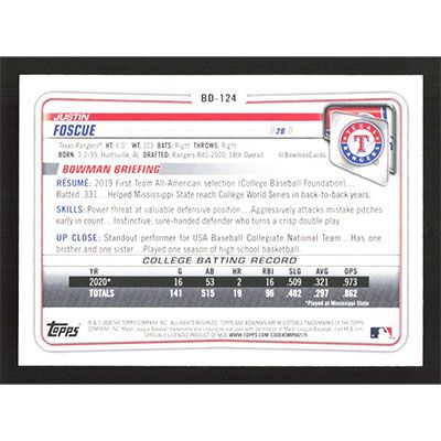 This is a 2020 Bowman Draft Justin Foscue baseball card. The card is #BD-124 and pictures show condition.