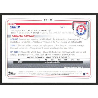 This is a 2020 Bowman Draft Evan Carter baseball card. The card is #BD-126 and pictures show condition.