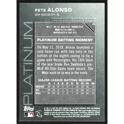 This is a 2020 Bowman Platinum Pete Alonso baseball card. The card is #49 and pictures show condition.