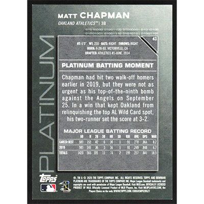 This is a 2020 Bowman Platinum Teal Matt Chapman baseball card. The card is #43 and pictures show condition. This card is limited; #'d 078/299. Team(s): Oakland Athletics