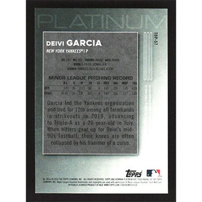 This is a 2020 Bowman Platinum Top Prospects Deivi Garcia baseball card. The card is #TOP-57 and pictures show condition.
