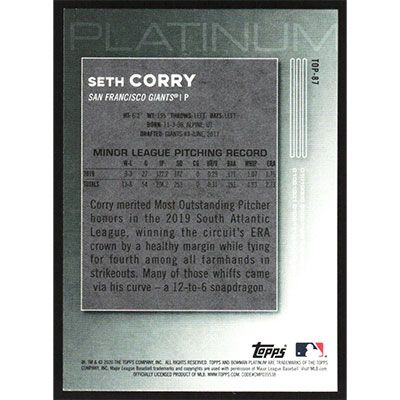 This is a 2020 Bowman Platinum Top Prospects Seth Corry baseball card. The card is #TOP-87 and pictures show condition.