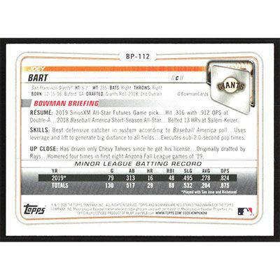 This is a 2020 Bowman Prospects Joey Bart autographed baseball card. This card has been signed, in blue, by Joey Bart, and is guaranteed authentic by Ballcardz.com. The card is #BP-112 and pictures show condition.