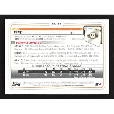 This is a 2020 Bowman Prospects Joey Bart baseball card. The card is #BP-112 and pictures show condition.