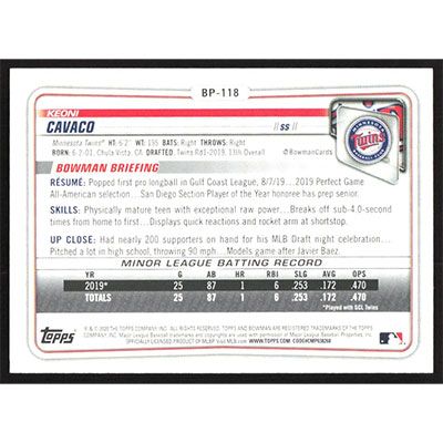 This is a 2020 Bowman Prospects Keoni Cavaco baseball card. The card is #BP-118 and pictures show condition.