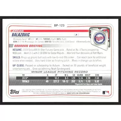 This is a 2020 Bowman Prospects Jordan Balazovic baseball card. The card is #BP-123 and pictures show condition.