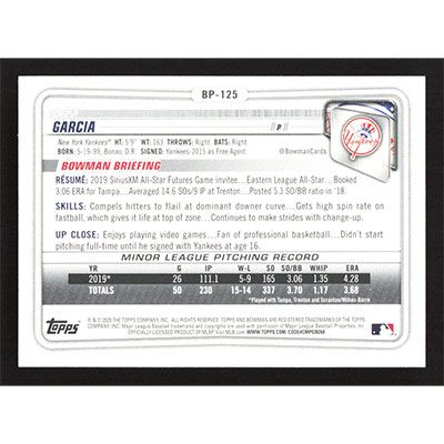 This is a 2020 Bowman Prospects Deivi Garcia baseball card. The card is #BP-125 and pictures show condition.