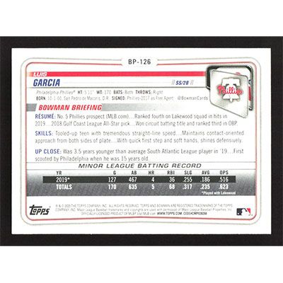This is a 2020 Bowman Prospects Luis Garcia baseball card. The card is #BP-126 and pictures show condition.